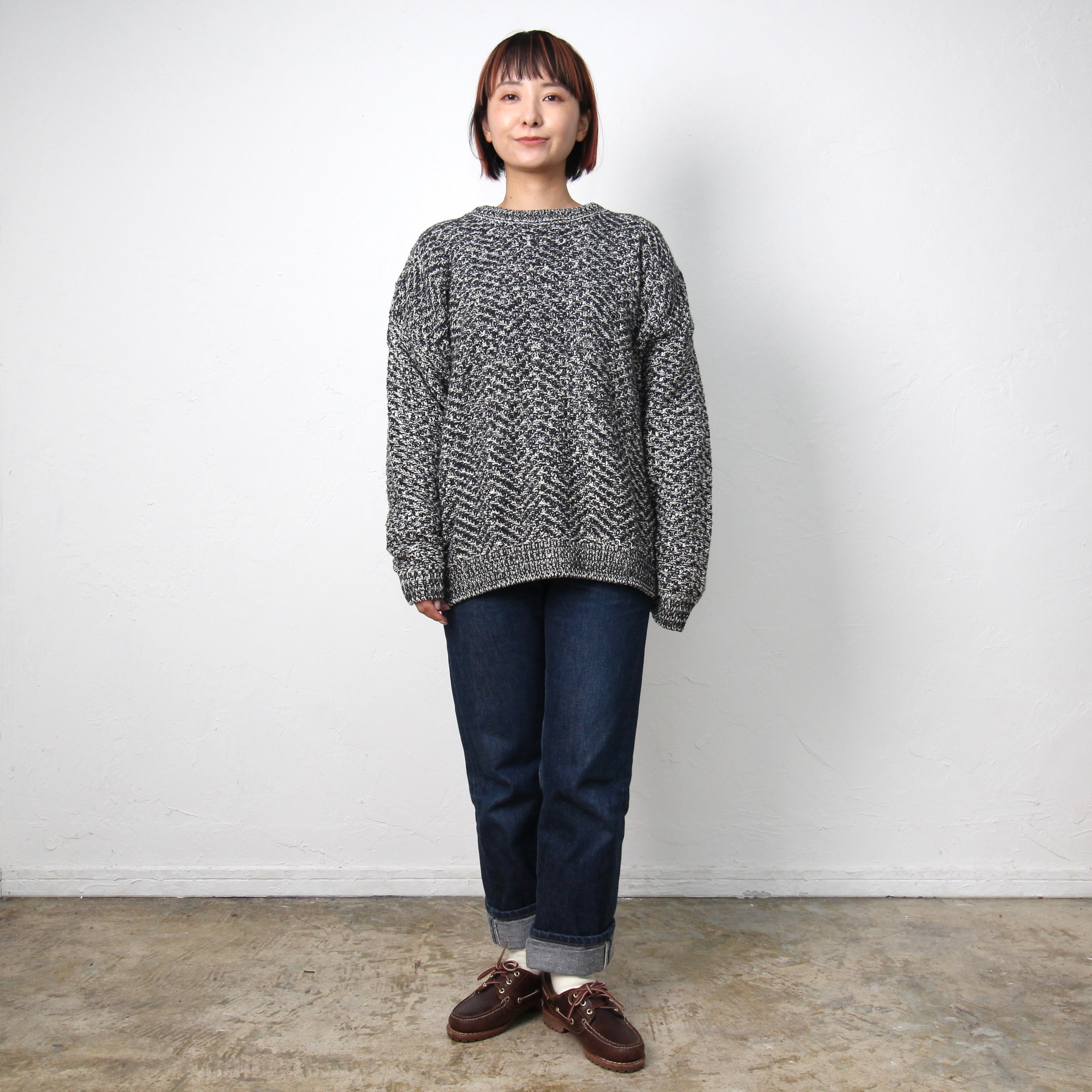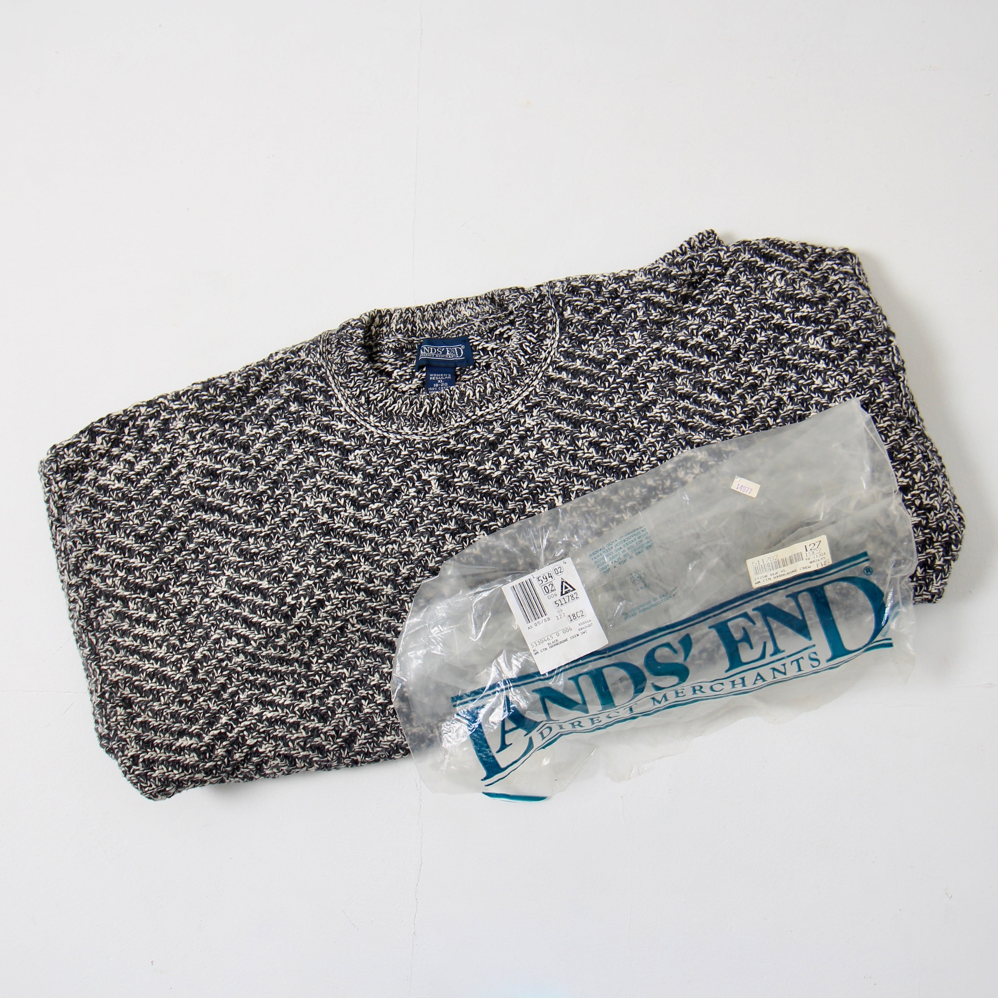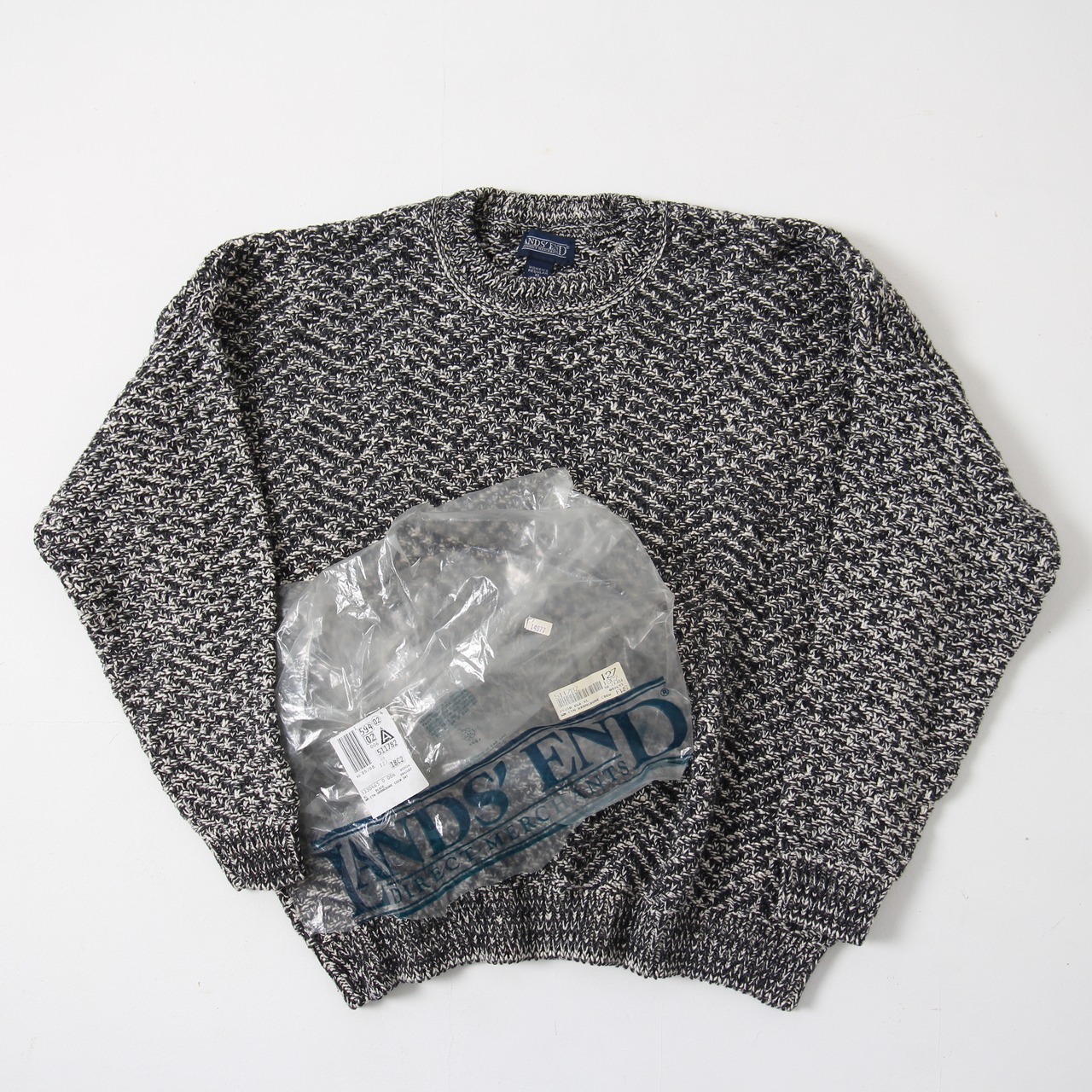 (DEADSTOCK)1980s〜LANDS END BLACK HRRNGBONE CREW KNIT SWEATER
